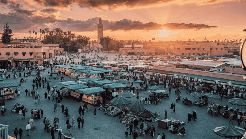 Spend the day immersed in the sights, sounds, and scents of Marrakesh, one of Morocco’s most captivating cities. Begin your morning with a visit to the Bahia Palace, an exquisite 19th-century residence known for its intricate tilework and tranquil courtyards. Continue to the Saadian Tombs, hidden for centuries and now beautifully restored, offering a glimpse into the grandeur of the Saadian dynasty. Next, explore the Koutoubia Mosque, Marrakesh’s most famous landmark, admired for its soaring minaret and elegant architecture. From here, head into the heart of the Medina—a maze of narrow alleys filled with vibrant souks. Browse stalls selling everything from handwoven rugs and spices to traditional lanterns and leather goods.